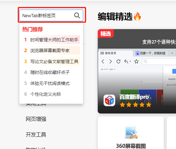 2. 商店搜索框中,输入“NewTab新标签页”进行搜索;
