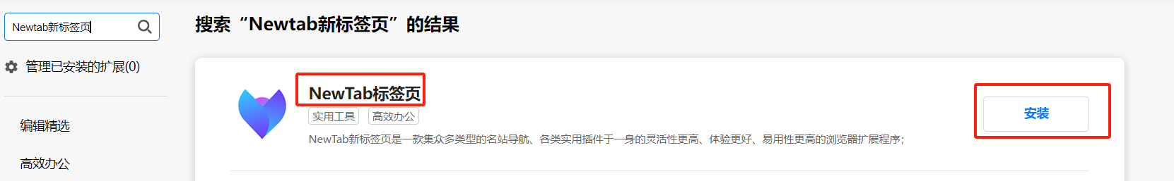3. 搜索到“NewTab新标签页”后点击“安装”